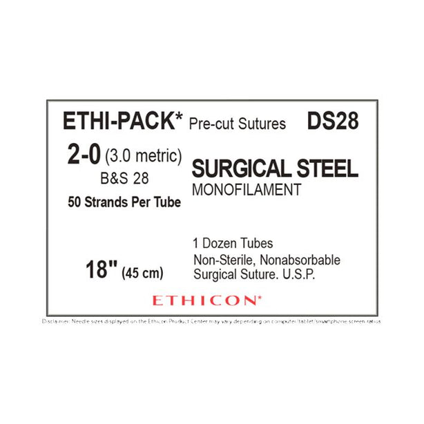 Ethi-Pack Surgical Steel Monofilament Suture, No Needle, Nonsterile, 18", Size 2-0 Surgical Stainless steel monofilament...