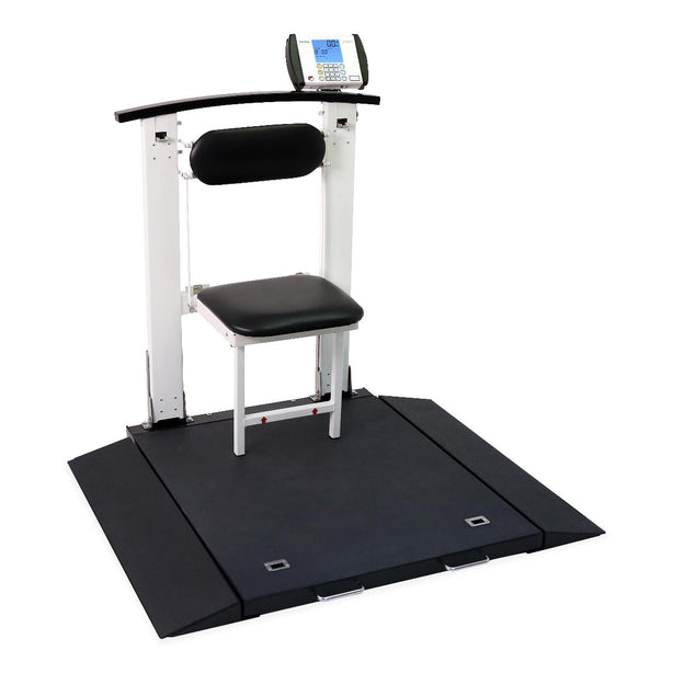 - Seat folds down for seated weighing and folds back up for wheelchair weighing
