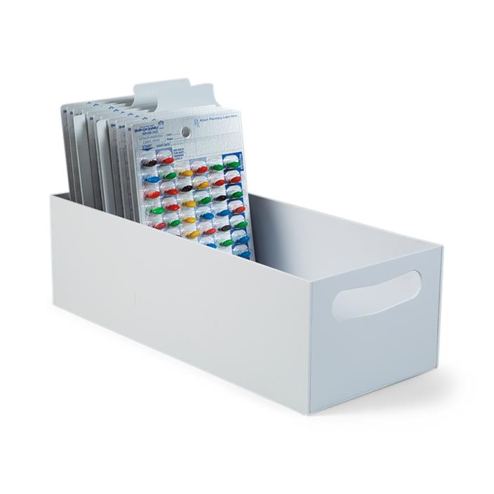 - Punch card bin helps hold cards upright for convenient storage and easy retrieval of unit dose medicine in foil-backed packages
