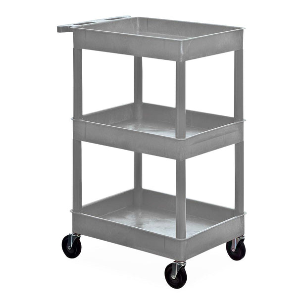 - Three-tier utility cart featuring 2.75" deep tub shelves to prevent items from sliding off