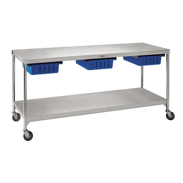 Stainless Steel Central Supply Table with Tote Boxes, Shelf and Casters, 84" x 36" x 34"