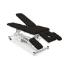 - Features include 2" high-density foam cushions with rounded corners, low-profile locking casters, a white powder-coat base with a single foot control pedal, and a 650 lb. weight capacity