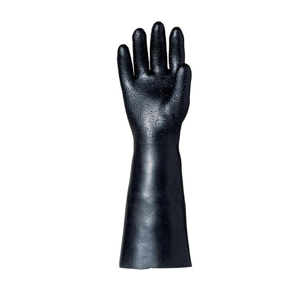 - Neoprene, gauntlet-cuff gloves resistant to a wide range of chemicals like acids, caustics, solvents, greases and oils