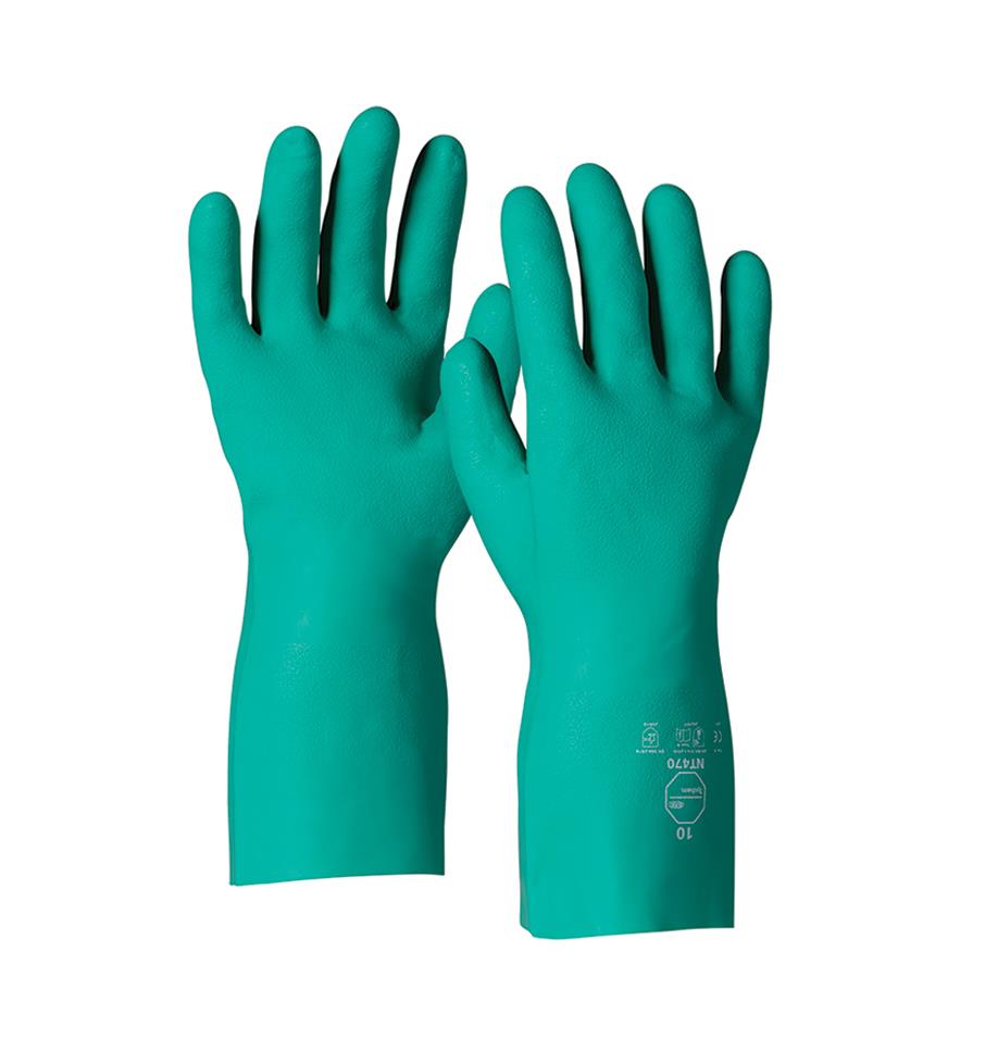 - Unlined, nitrile coated gloves with gauntlet cuffs