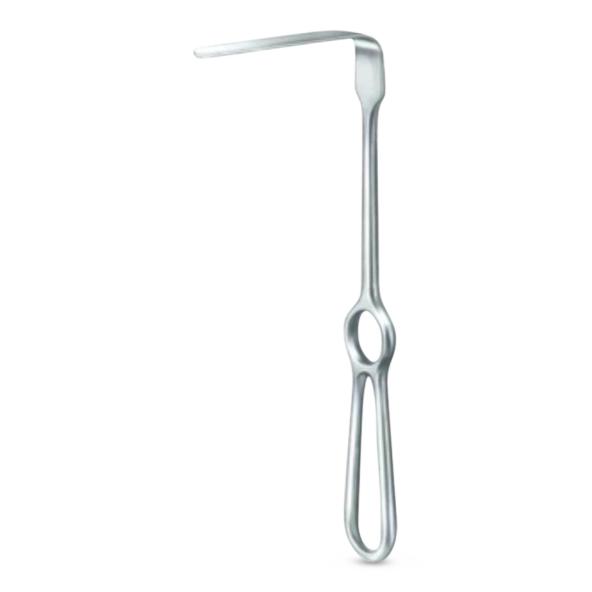 • Retractor with long, L-shaped blade is used to retract soft tissues and provide an expanded view of the surgical field in pelvic surgeries