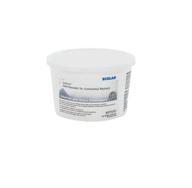 - OptiPro Solid Descaler is formulated to dissolve and remove lime, scale, milkstone, uric salts, iron stains, alkaline detergent residues, and other mineral deposits
