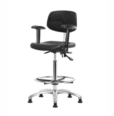 Class 100 Cleanroom Polyurethane High Bench-Height Chair, Adjustable Height, 24.5" x 33.5" H, No Seat Tilt, Adjustable Armrests, Chrome Foot Ring, Glides, Black