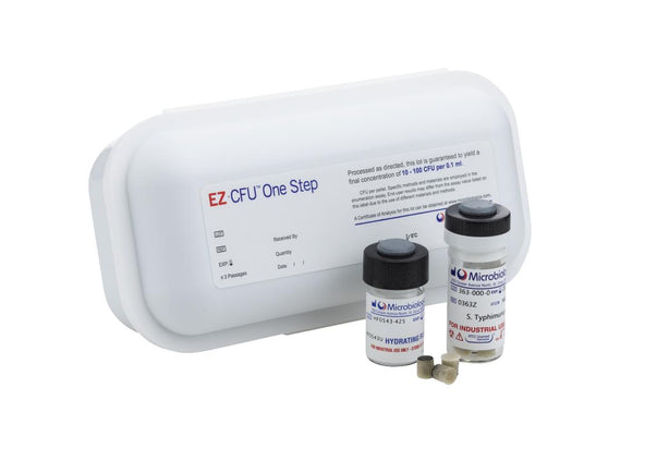 - EZ-CFU One Step: 2 vials of 10 pellets, 10 vials of hydrating fluid, Certificate of Assay