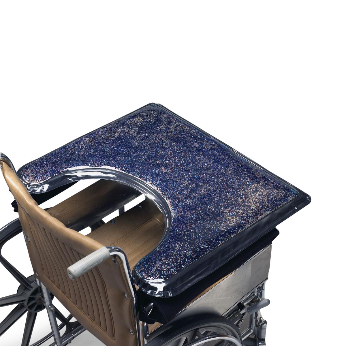 - Cushioned tray rests across standard wheelchair armrests to keep Alzheimer's patients (and many others) content with glittery, floating stars for visual stimulation
