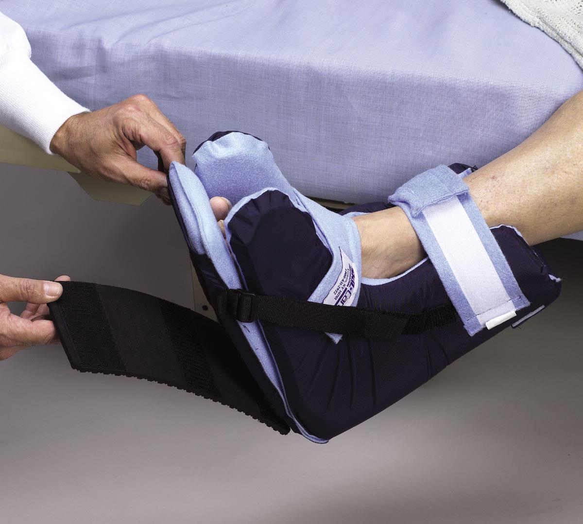 - Other features include adjustable straps for multiple locations, belt to accommodate foot drop, water-based gel insert lowers, and wipe-clean cover