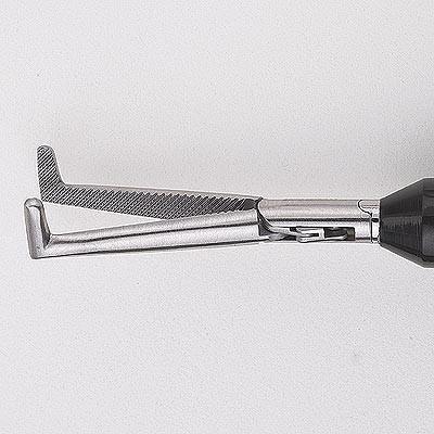 • Right angle, ratcheted, finger ring forceps commonly used for working in obscured surgical sites during laparoscopic procedures